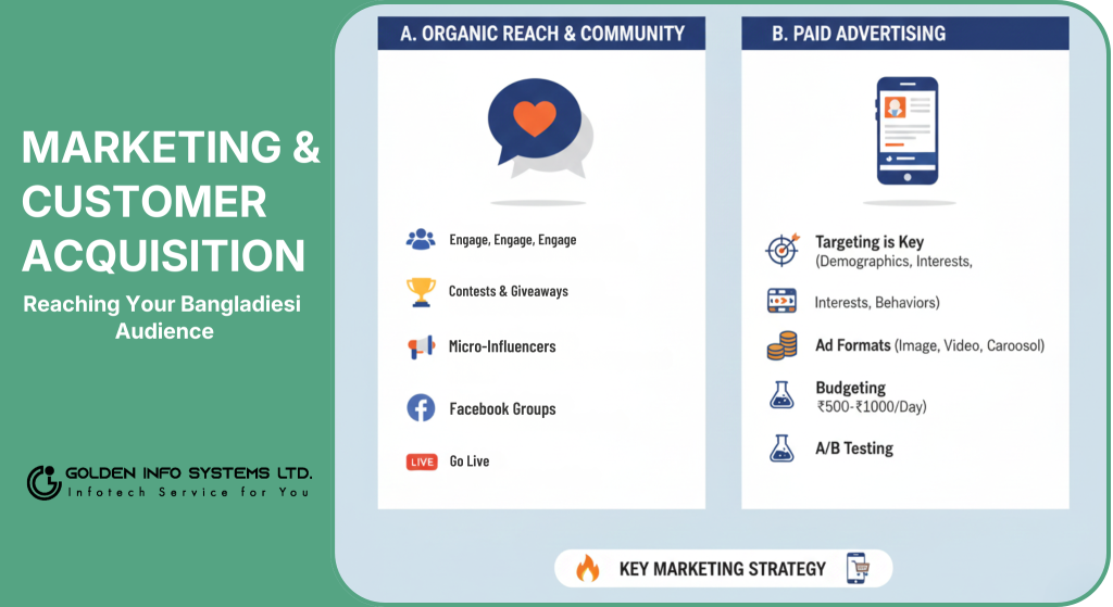 - Digital Marketing: Running initial targeted Facebook/Instagram ads (e.g., ৳500-৳1,000 per day for one week).