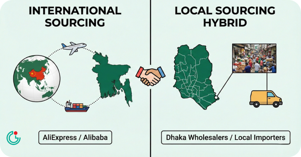 | 2. Local Sourcing Hybrid | Dhaka Wholesalers (Chawkbazar), Local Importers | Fast fulfillment (1-3 days), higher trust | 1–3 days (viaPathao/RedX/Steadfast) | Fashion, electronics accessories, general goods with high demand. |